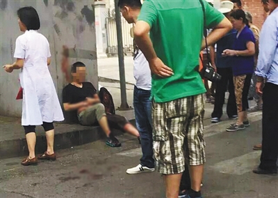 目击者提供的照片显示,这名伤者手捂腹部,身上都是血。