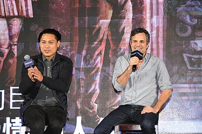 影片导演朱浩伟和主演“绿巨人”马克·鲁法洛