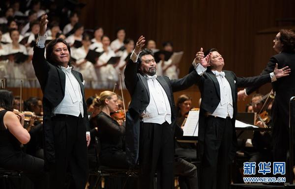 6月27日,中国男高音歌唱家魏松(中)、莫华伦(右)和戴玉强(左)在澳大利亚悉尼歌剧院举行的慈善音乐会上演唱。中国三大男高音歌唱家戴玉强、莫华伦和魏松27日晚在澳大利亚悉尼歌剧院举行慈善音乐会,向澳大利亚观众奉上了世界水平的歌剧表演,也为在场的众多华侨华人带来乡音。新华社发(朱宏业摄)