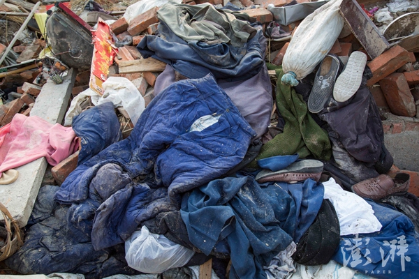 略显陈旧的蓝衣蓝裤、胶鞋在灰色的瓦砾间变得刺眼。“好的他总舍不得穿。”王德胜说起父亲。