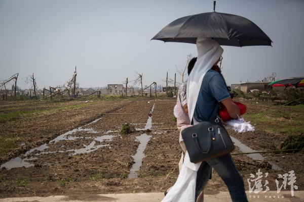 2016年6月25日,江苏省盐城阜宁县陈良镇,王德胜拎着一大摞纸钱往家的方向赶,几乎夷为平地的村庄让人难辨方向。 本文图片 澎湃新闻记者 吴越