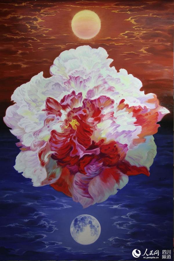 宽2米、高3米的《同辉》画面中心是一朵硕大的芙蓉花,上方是冉冉升起的旭日,下方是一轮明朗的皓月,四周烘托着形态各异的云霞,气势恢宏,让人过目难忘。