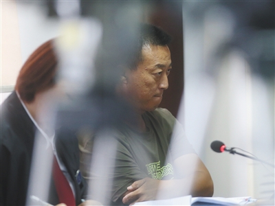 昨日,因电动车电瓶充电时爆炸起火烧死女儿,状告电动车及电瓶厂商的郭先生坐在法庭上。新京报记者 王贵彬 摄