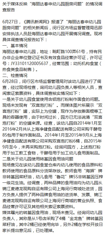 该幼儿园位于上海市闵行区。当天,该区市场监管局派员对该幼儿园进行调查,到晚上,闵行区新闻办公布初步调查结果:海丽达春申幼儿园持有民办非企业单位登记证书及有效食品经营许可证,经营范围为“幼托机构食堂(热食类食品制售)”。经调查,给教师和幼儿食用的均为非转基因食用油,“媒体曝光的转基因食用油,现场未查见。经询问幼儿园负责人,其称是从1号店采购了4桶‘金龙鱼’牌转基因菜籽油”;媒体图片所展示“双喜泡打粉”罐,实际上为空罐;媒体曝光的梨尚未验收入库,因家长提出梨有问题,已全部做丢弃处理;现场检查,幼儿园已经对厨房刀具生锈、有小虫子和小蚂蚁等卫生问题进行了整改。