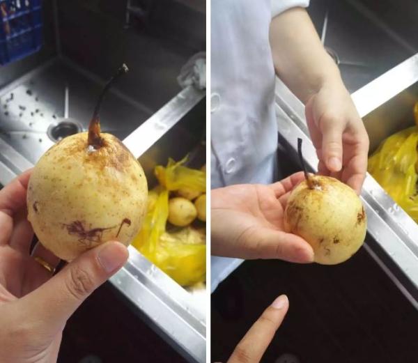 同日,有家长称,在厨房角落里发现一个黄色塑料袋,里面有10个烂梨,有些长毛,有些已经烂得不能再吃,但被告知这些是给孩子们做下午点心用的,而且600个小朋友分10个梨。