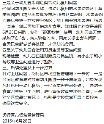 关于幼儿园采购烂梨给幼儿食用问题,报告称,被曝光的梨是该园6月23日采购,制作“银耳梨羹”使用,幼儿园当天共采购了6斤梨,尚未验收入库,因家长提出梨有问题,当天已全部做丢弃处理,未供幼儿食用。