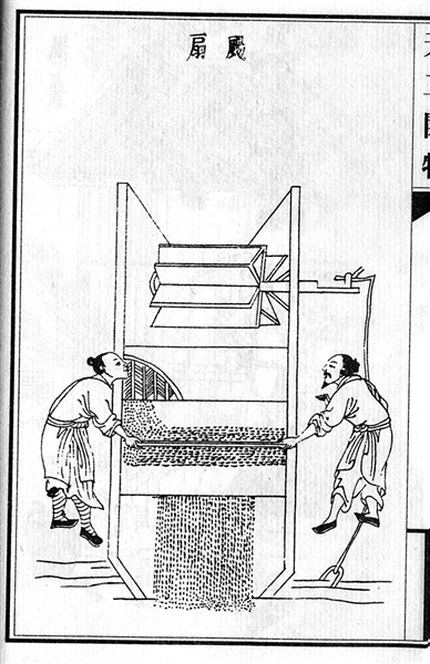考古发现有力的证明,汉代人已然使用如此成熟形制的扇车。1973年,河南济源县一座汉墓中就出土了一座陶飏扇明器,构造完备,设置周全,旁边还有一个陶俑伸手做摇动把柄的姿态。飏扇明器之旁并且配套设有一座陶米碓,同样有个陶俑在其上做出操作碓杵的姿势,很显然,在汉代,把米舂过之后,倒入飏扇分离糠麸,是生活中颇为常规的程序。