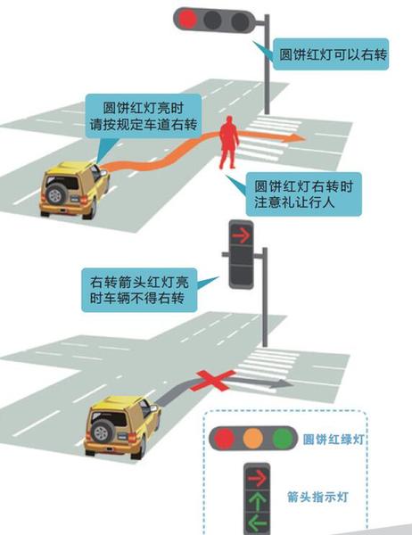 市交巡警总队相关负责人表示,根据《道路交通管理条例》相关规定,十字路口的圆盘灯和向位灯(即箭头灯)的含义是有区别的。向位指示灯红灯亮时,车辆是不允许右转;在没有特别交通指示(如交通指示牌或交警指示)的情况下,机动车遇圆盘红灯可以右转,不算闯红灯违章,但右转车辆要依法让行才行。