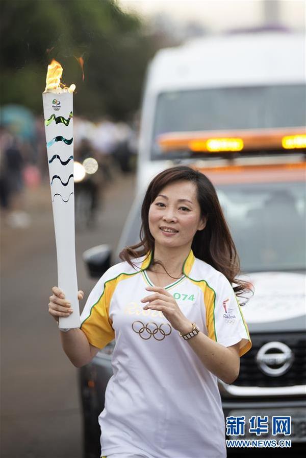 6月30日,火炬手赵彦红在火炬传递中。 当日,来自中国的里约奥运会可口可乐火炬手在巴西伊瓜苏参加里约奥运会火炬传递活动。新华社记者李明摄