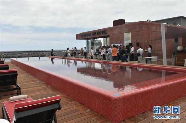 6月30日,全球首家由葡萄牙足球巨星克·罗纳尔多投资的酒店开业仪式在他的家乡马德拉岛首府丰沙尔举行。该酒店位于丰沙尔市中心,共有49间客房,包括25间C罗主题客房、23间高级房和1间C罗主题套房。图为佩斯塔纳CR7酒店顶层的游泳池(6月30日摄)。新华社记者张立云摄