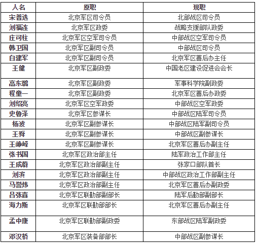 值得注意的是,北京军区是唯一诞生了两位战区司令的军区。原军区司令员宋普选出任北部战区司令员,原军区副司令员韩卫国出任中部战区司令员。