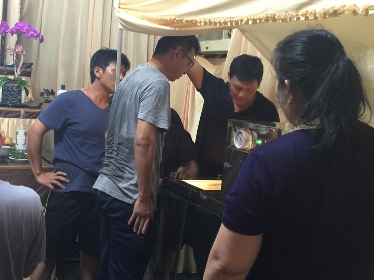 金江舰长林伯泽、兵器长许博为、士官长陈铭修、中士高嘉骏(依左至右)到黄文忠灵堂前上香下跪道歉。