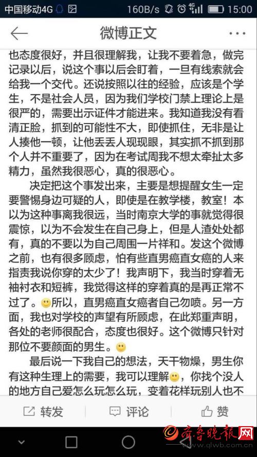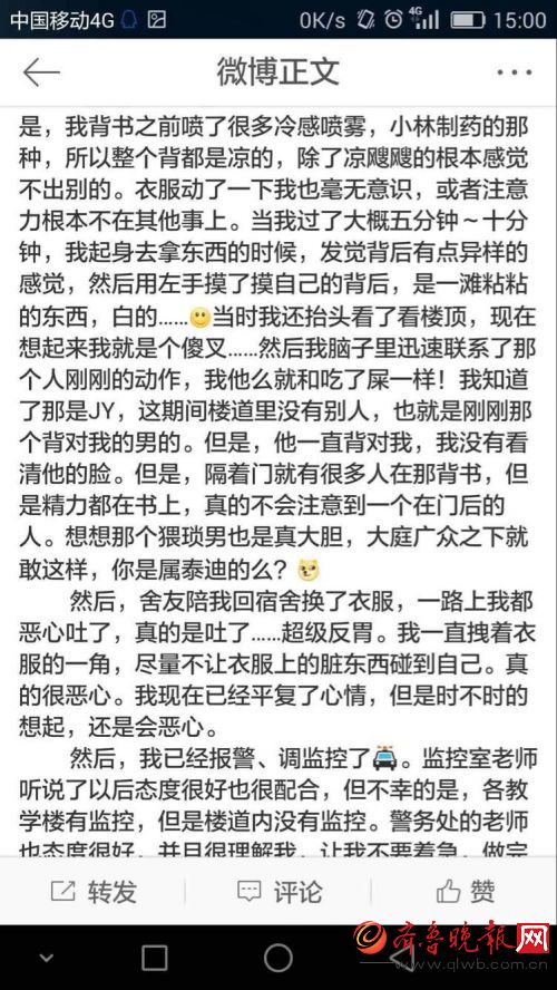 原标题:山师长清校区现变态男 一女生发现身后有一片精液