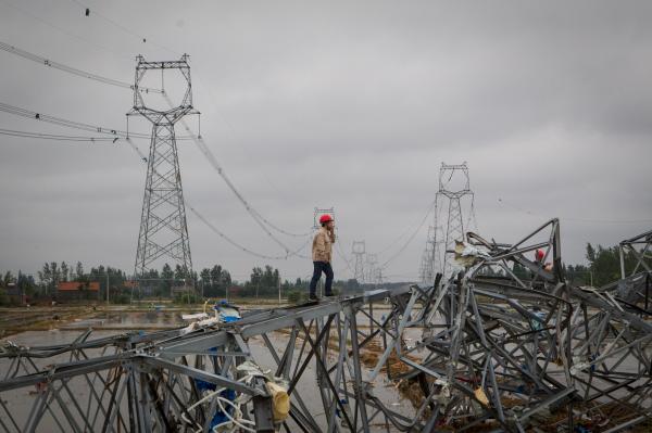 2016年6月24日,江苏省盐城市阜宁县,g204国道烟沪线路段周边的铁塔倒塌,受损严重。 澎湃见习记者 韦毅 图