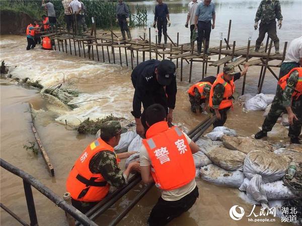 人民网钟祥7月4日电 受连续强降雨影响,天门河荆门市屈家岭管理区平原村五队堤防段出现溃口,溃口处和钟祥市相邻,约长18米,水流湍急,该处溃口淹没钟祥旧口镇贡士村、温巷村、陈台村三个村11000亩农地,农作物面临绝收。为了尽可能减少受灾损失,7月4日凌晨5时,钟祥公安民警、武警消防官兵60余人组成抢险突击队,和群众一起装填沙袋,并用两条运输船来回运输,他们手挽手一起堵溃口,将沙袋垒放在溃口处。下午2:40,现场下起了倾盆大雨,抢险工作一刻也没有停止。(刘杰)