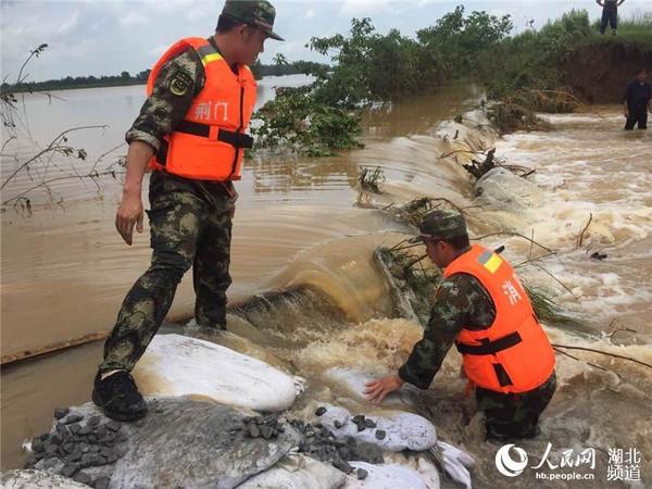人民网钟祥7月4日电 受连续强降雨影响,天门河荆门市屈家岭管理区平原村五队堤防段出现溃口,溃口处和钟祥市相邻,约长18米,水流湍急,该处溃口淹没钟祥旧口镇贡士村、温巷村、陈台村三个村11000亩农地,农作物面临绝收。为了尽可能减少受灾损失,7月4日凌晨5时,钟祥公安民警、武警消防官兵60余人组成抢险突击队,和群众一起装填沙袋,并用两条运输船来回运输,他们手挽手一起堵溃口,将沙袋垒放在溃口处。下午2:40,现场下起了倾盆大雨,抢险工作一刻也没有停止。(刘杰)