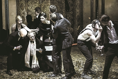 在邵宾纳剧院的《理查三世》中,舞台后区是一栋两层的廊房结构。长长的走廊,长长的斜梯,加上直梯和滑柱,使舞台空间四通八达。但其作用更多是功能性的。每当场景转换,众演员迅速登场,或从空中滑下,或穿插奔跑,再加上狂躁的鼓乐和满台飞舞的从彩炮喷射出来的银色纸花,造成强烈的动感,散发巨大的身体能量。但其营造的气氛,并不是特定戏剧场景的气氛;其动感与动能,也不是特定人物所必需的内在能量与外在能量。其刻意营造的是某种犹如综艺节目的娱乐效果。导演显然并不看重深度模式,并未试图去挖掘原作蕴含的意义。他宁可在一种游离或偏离中,展现自己的态度。你可以有自己的感受,自己的读解,但不必处处探测微言大义,强行索解。摄影/Arno Declair![]()