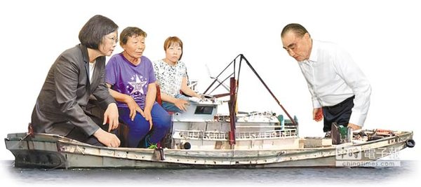 蔡英文(左)慰问不幸身亡的船长黄文忠遗孀(左二)和女儿(左三)。图片来源:台湾《中时电子报》