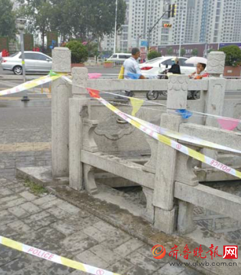上午11时,在事发地点—— —位于堤口路西工商河的桥上,记者看到,桥东侧护栏上有一段出现损坏,周边也已经拉起了警示线,破损的地方也已经缠上铁丝。护栏上部的长方体石块已经缺失,掉在了桥下约3米的坑里,坑里并没有水。