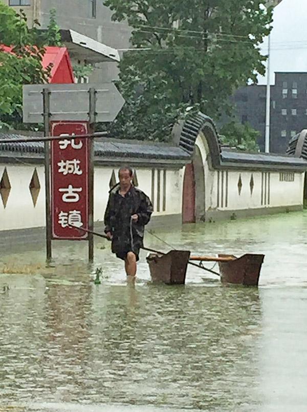 目前孔城镇内的孔昌路也仍有深达两米的积水,在孔昌路和孔城老街上都能看到划船出行的居民。