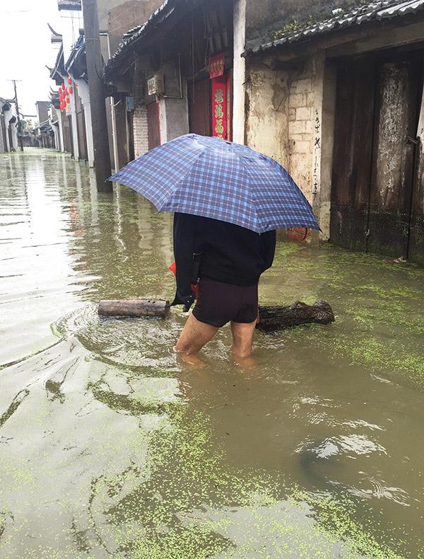 孔城老街居民马世方趟过积水。