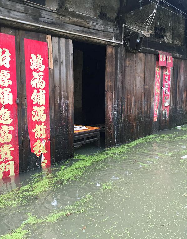 孔城古镇内沿街的部分店铺严重进水。