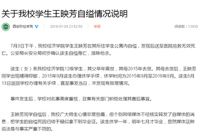 对此,7月4号晚西安财经学院通报了情况说明:7月3日下午,经济学院学生王某在其所住学生公寓内自缢,发现后送至医院抢救无效死亡。经长安分局警方初步确认该生自缢身亡,排除他杀。