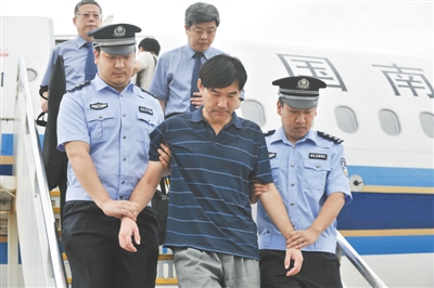 2015年6月8日,逃亡境外7年之久的孙新从柬埔寨被押解回国,成为“红色通缉令”中首个归案的北京被通缉人员。 新华社发