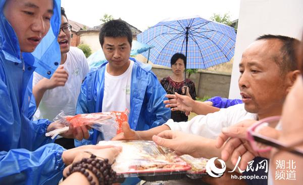 人民网武穴7月6日电 5日,湖北省武穴市楚天公益志愿者协会和雨花斋素食馆两个团队爱心人士慷慨解囊,为前来武穴抢险救灾的某舟桥旅官兵和抗洪抢险突击队送去矿泉水、方便面、盒饭和姜汤。为花桥镇破圩家园失守的灾民送去盒饭水果和矿泉水,一表他们对帮助武穴战胜洪魔抗洪官兵的无限敬意,对灾区群众尽一点绵薄之力。(冯怡红)