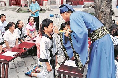 6月23日,丰台七小六年级的全体学生来到孔庙,举行了“成童礼”活动。活动中,同学们和家长一起参观了孔庙,感受到“至圣先师”孔子的神圣。在大成殿前,六年级学子举行了大型“成童礼”。同学们身着汉服,站于大成殿前,当场学习行礼仪式。仪式中,老师为同学们点朱砂,同学们向老师行四拜礼,向父母行三拜礼,感谢老师谆谆教导,感谢父母养育之恩,用心书写“人”字,立志做一名孝顺父母、学有所长、知行合一的少年。随后的“大成礼乐”表演,让家长和同学们共同感受到了中华传统文化的精髓。