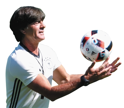 北京时间明晨3点,德国队将在马赛迎战东道主法国队,这被视为提前进行的决赛。图为德国队主教练勒夫昨日训练时对球“发功”。