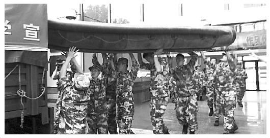 潜水队员将橡皮艇运往灾区。 熊峰摄