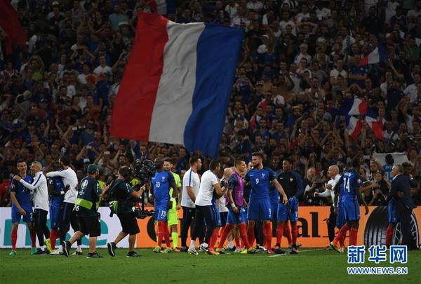 7月7日,法国队球员在赛后庆祝胜利。当日,在法国马赛进行的2016年欧洲足球锦标赛半决赛中,法国队以2比0战胜德国队,晋级决赛。 新华社记者郭勇摄