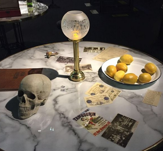 这一时期的展区是最为独特的一部分,类似咖啡馆,又好像梵高的私人画室的布置呈现展厅中,圆桌上压着梵高的书信和绘画,昏暗的灯光、金黄的柠檬、石膏雕像和骷髅,还有一管一管五彩的颜料。调色盘上依旧是梵高最常用的两种颜色——蓝色和黄色,桌面上的咖啡杯好似还有余温,杯沿留着梵高喝过的咖啡渍。