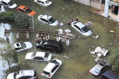 7月8日,武汉南湖雅园小区,积水最深处超过2米,几位居民正在挪移被水浸泡的汽车。民政部数据显示,湖北1265.5万人受灾,52人死亡。新京报记者 彭子洋 摄