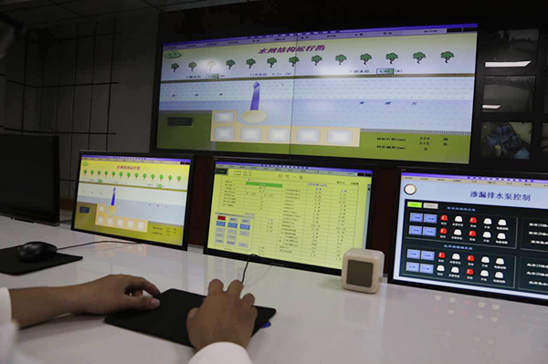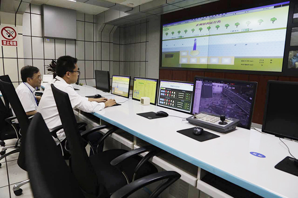 苏州河口水闸管理所,大屏幕显示了水闸结构运行图。