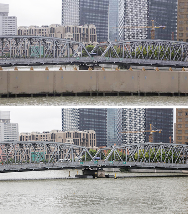 苏州河口水闸管理所正在开闸放水,水闸闸门从关闭状态(上)到闸门整体没入水底(下)。