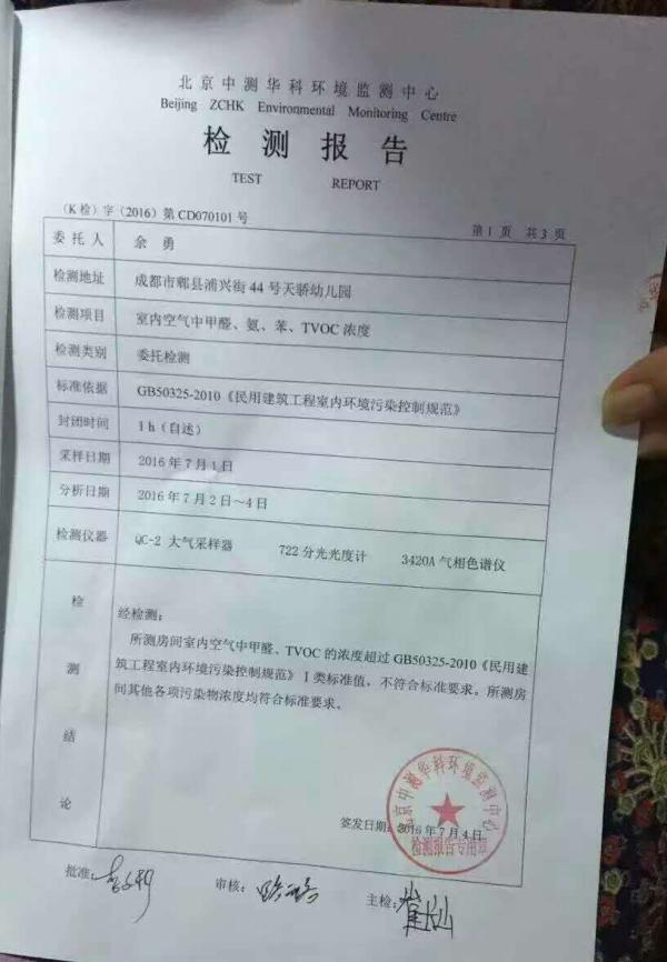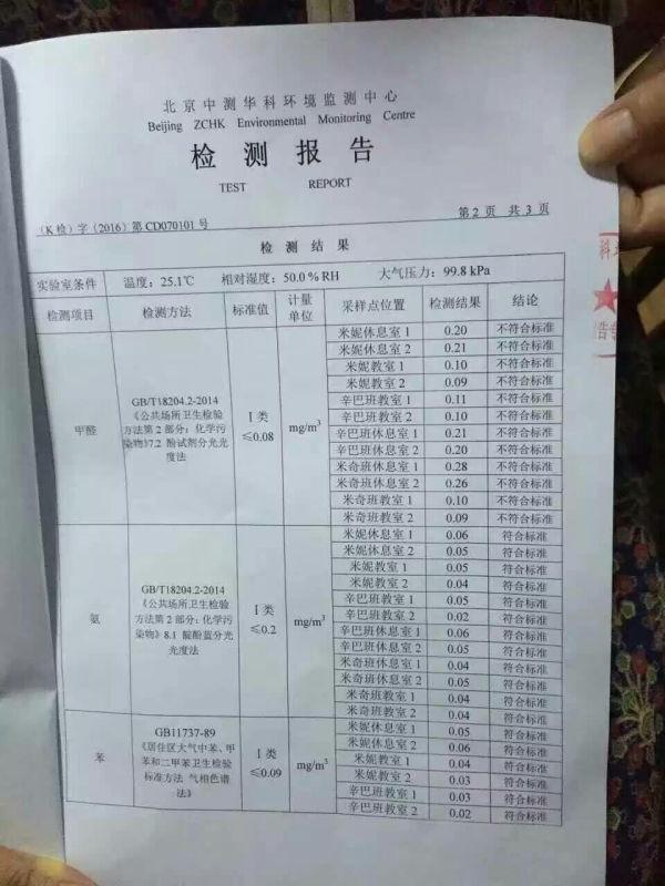 北京中测华科环境监测中心对该幼儿园的检测报告。 图片来源于网络