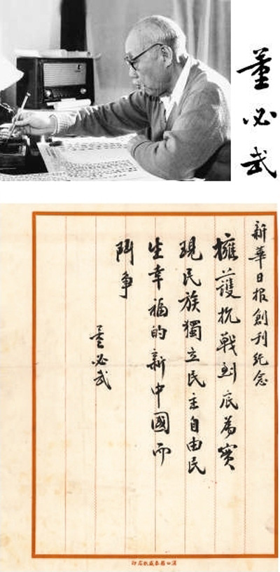 董必武1938年为《新华日报》创刊题词:拥护抗战到底,为实现民族独立、民主自由、民生幸福的新中国而斗争。