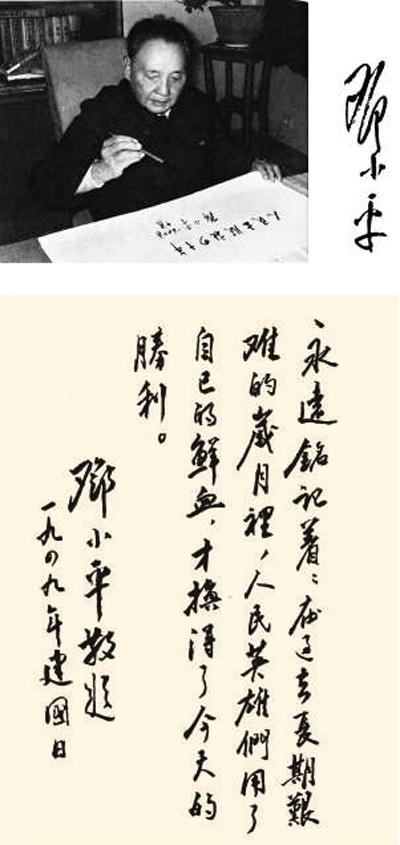 邓小平1949年10月1日题词:永远铭记着:在过去长期艰难的岁月里,人民英雄们用了自己的鲜血,才换得了今天的胜利。