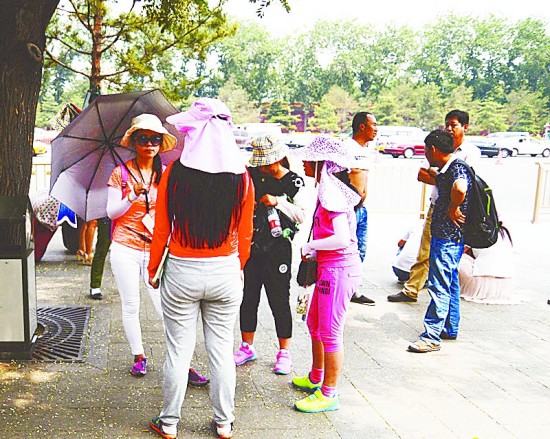在离国家博物馆不远处的树荫下,几位导游在等待游客。北京的强紫外线和高温让他们不得不“全副武装”。安徽师范大学 潘衡芷/摄
