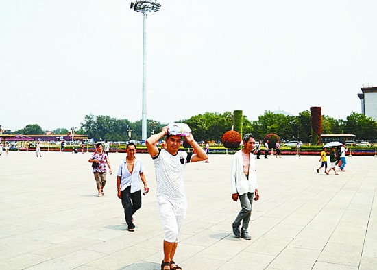 天安门广场上,为了防暑,一行人将刚买来的矿泉水顶在头上。7月6日中午12点,北京的气温为32摄氏度。安徽师范大学 潘衡芷/摄