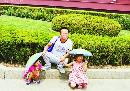 从外地到北京旅游的一家人正在天安门广场合影留念。父母为孩子们买了头戴式遮阳伞,两个女儿对着镜头做出胜利的手势。安徽师范大学 潘衡芷/摄
