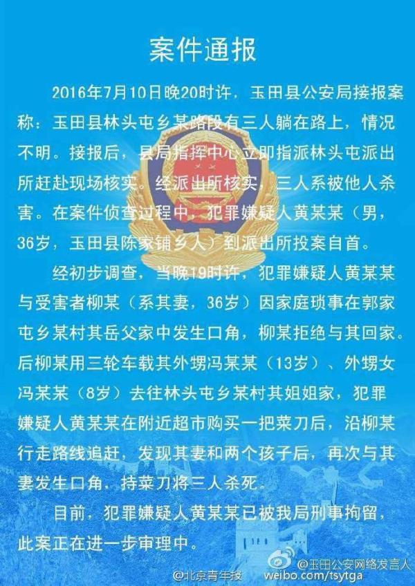 11日,玉田县公安局官方微博通报:犯罪嫌疑人黄某,36岁。10日晚19时许,黄某与受害人柳某(系其妻,36岁)因家庭琐事在岳父家中发生口角后,柳某拒绝与其回家,并用三轮车载着一男一女两个外甥(分别为13岁、8岁)前往林头屯乡姐姐家。黄某见状,在附近超市购买一把菜刀后,沿柳某行走路线追赶。见面后,黄某与柳某再次发生口角,并持刀将包括柳某在内的三人杀害。