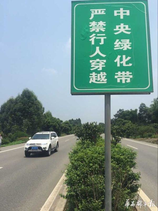 7月11日中午,华西都市报记者驾车从S106线535公里处出发,往丹棱方向行驶。车辆驶出不到2公里,道路中间的绿化带就多次出现标识标牌,提示行人不要穿越绿化带。