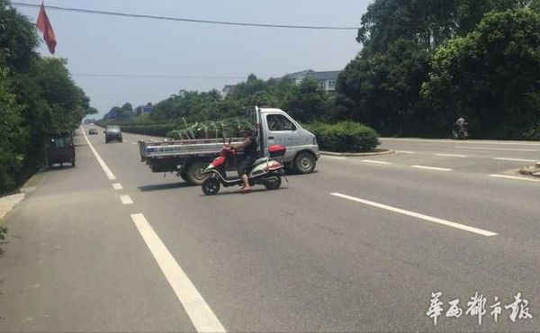 然而,车行至540公里处,一辆摩托车突然从右侧横穿出来,穿过中间的绿化带后,又横穿至左侧道路最右边的车道,朝眉山城区方向驶去。紧接着,更让人揪心的一幕发生了:一辆灰色小型货车以同样的方式,向对面的车道穿去,而一辆红色摩托,则从对面的车道穿了过来,两车就在这条限速80码的纵向车道上,上演了慢悠悠的横向对穿。
