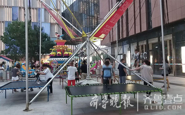 (在一家商场外面,蹦极设施吸引了不少孩子玩儿。齐鲁晚报·齐鲁壹点记者 于悦 摄)