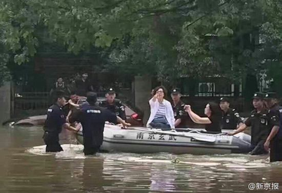 肆虐南方的强降雨导致南京市严重内涝,前线有武警队员守卫大堤,街道里有消防官兵划着冲锋舟护送市民撤离,突然出现此景,还真难不成为热点。