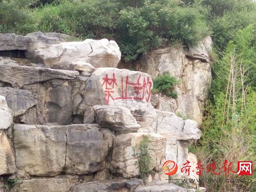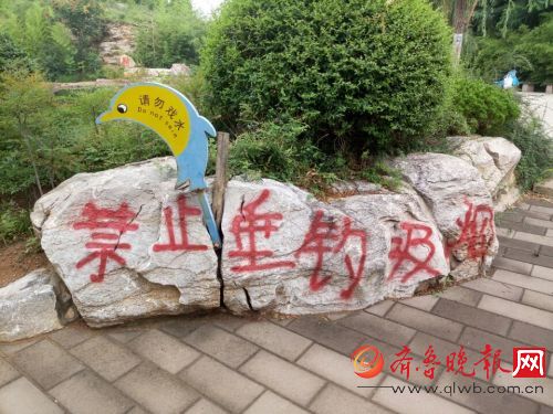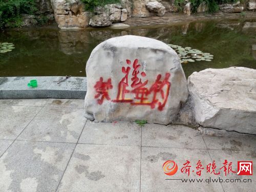 14日,市民尹先生向齐鲁晚报记者反映,省城东部的马三坡森林公园内多处 景观石上被用红漆喷涂上了“禁止垂钓”,非常刺眼。