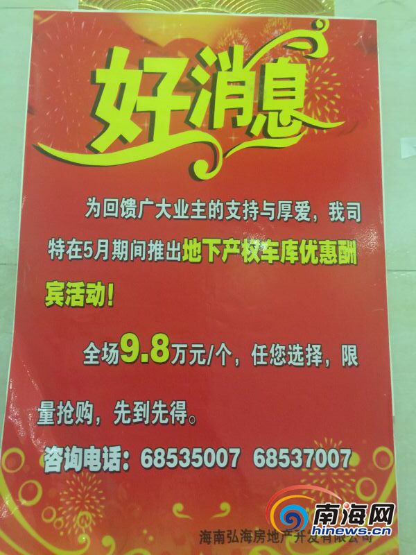 虽然业主们对于开发商出售车位的做法十分“不满”,但在该小区显目处,南海网记者却看到开发商“海南弘海房地产开发有限公司”粘贴出的销售车位广告,其称“为回馈业主,5月期间推出地下产权车库优惠活动,全场9.8万元一个,限量抢购,先到先得”。